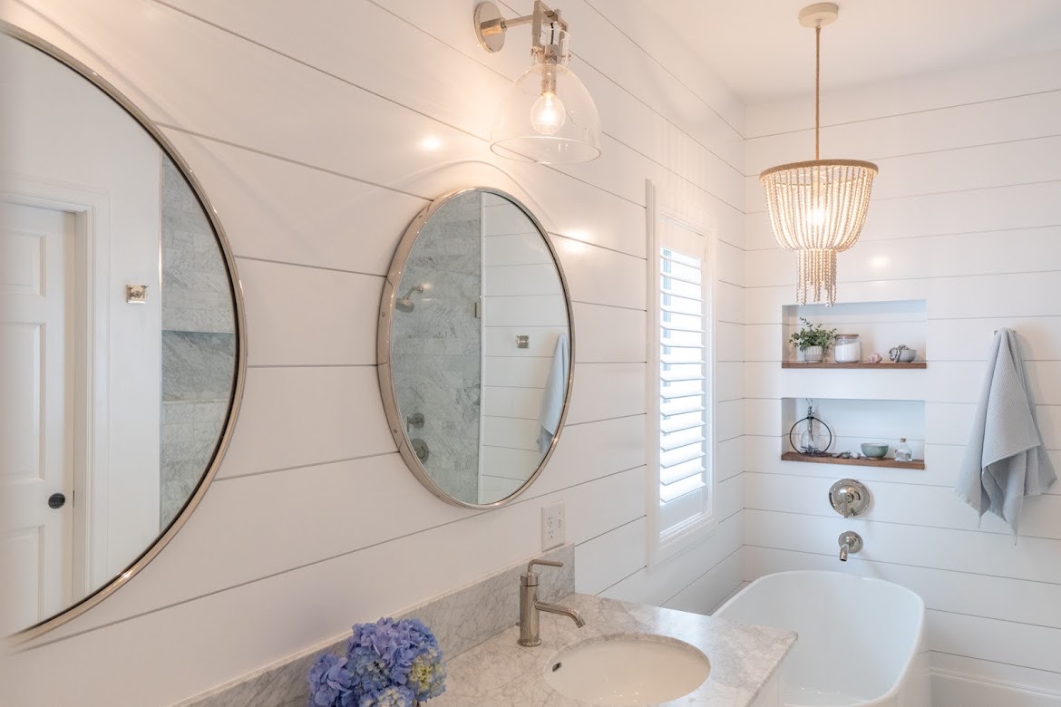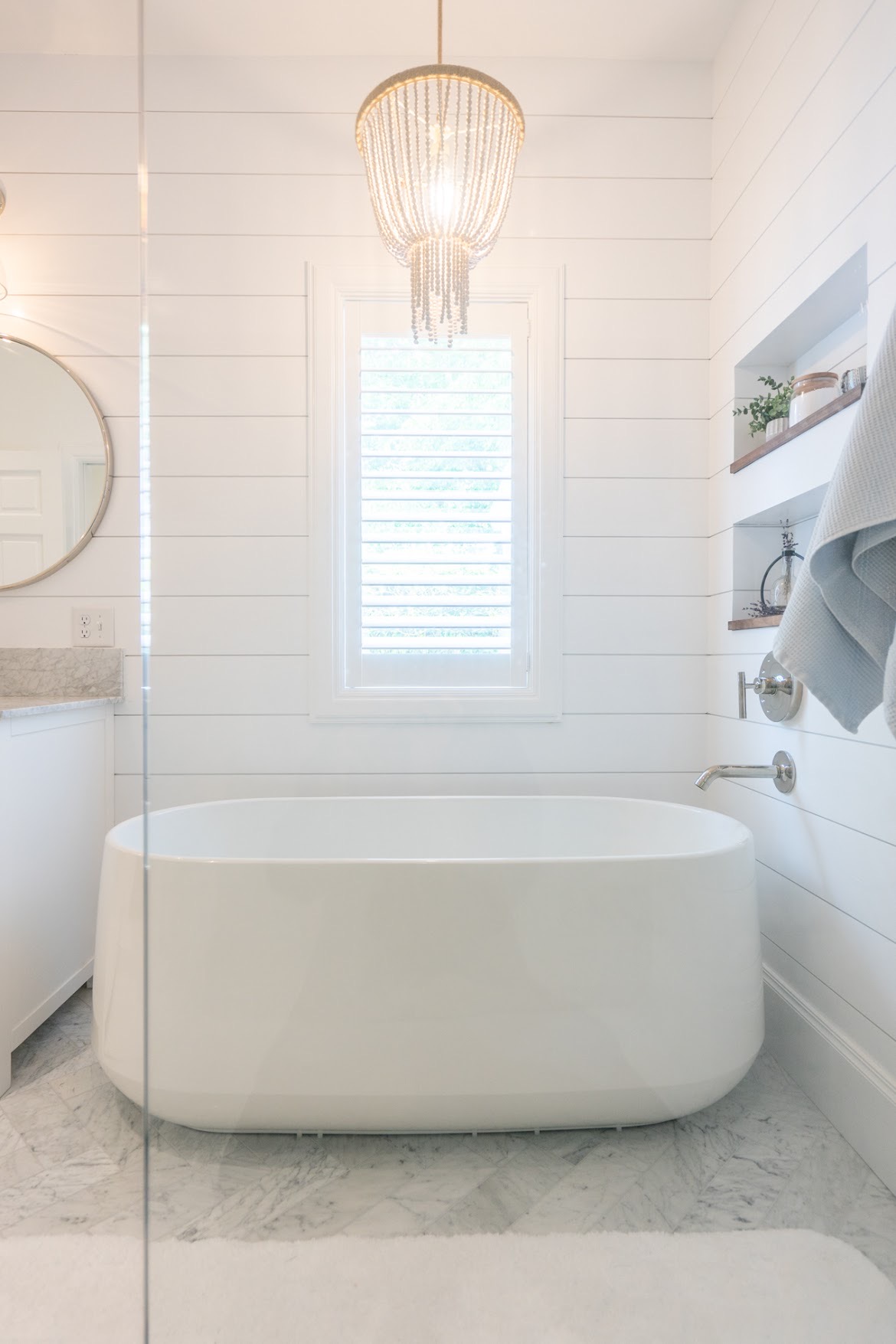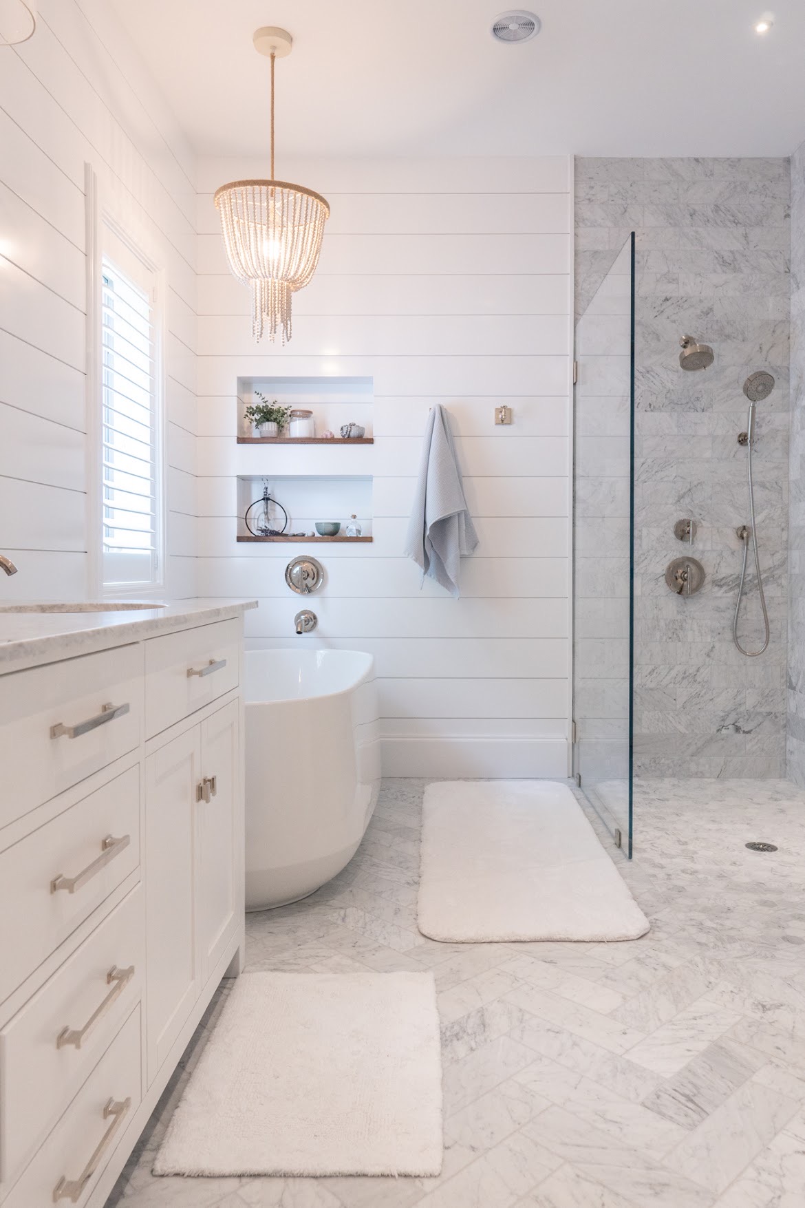 White shiplap walls add subtle dimension, while marble flooring introduces gentle movement and natural elegance. The overall palette keeps the space bright and airy, allowing texture to take center stage.